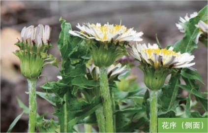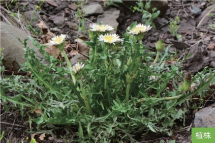 形态特征:多年生草本,高5~25厘米。叶基生,莲座状;叶片倒披针形,长5~15厘米,宽0.5~2厘米,基部渐狭成柄,羽状浅裂至深裂,顶端裂片三角状或长圆状三角形,全缘或具齿毛。头状花序;总苞片3层,外层总苞片顶端具明显角状突起;舌状花白色,边缘花舌片背面有紫色条纹。瘦果褐色,长3.5~5毫米,上部具刺状突起,中部以下具瘤状突起,喙长约4毫米。花果期5—6月。