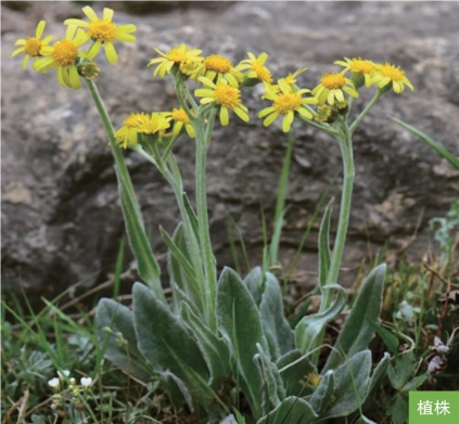 形态特征:多年生草本,高10~50厘米,全株密被蛛丝状白色绵毛。茎单一,直立。基生叶莲座状,叶片卵状长圆形或匙形,长2~10厘米,宽1~2厘米,基部下延至柄成翼状,边缘具小齿或全缘;茎生叶互生,向上渐小,下部叶倒披针形,或倒披针状长圆形,长2~6厘米,宽0.5~1厘米。头状花序排成伞房花序;总苞近筒状,总苞片1层;舌状花黄色。瘦果狭卵形,长约5毫米,被密毛。花期5—6月,果期6—7月。