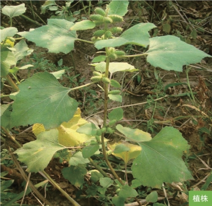 形态特征:一年生草本,高达1米,全株被粗糙伏毛。茎直立,带黑紫色斑点。茎生叶互生;叶三角状卵形或心形,长4~9厘米,宽5~10厘米,近全缘或不明显3~5浅裂。雄性头状花序球形,雄花多数,花冠钟形,黄绿色;雌性头状花序椭圆形,内层总苞片结合成囊状,成熟时坚硬,绿色或黄绿色,宽卵形或椭圆形,疏生钩状刺。瘦果黑灰色,椭圆形,长7~10毫米。花期7—8月,果期9—10月。
