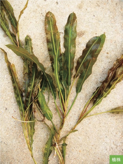 形态特征:多年生沉水草本。茎细长,不分枝或少分枝。叶互生,花序下的叶常对生;叶片线状披针形或披针状长圆形,具长柄,长8~16厘米,宽0.8~2厘米,边缘浅波状,有细微锯齿;托叶膜质,与叶片离生,鞘状抱茎。穗状花序顶生;花小,花被片4枚,绿色。果实倒卵形,长约3毫米,两侧稍扁,背部具3脊。花果期6—9月。