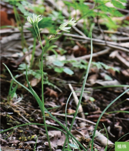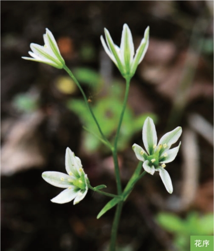形态特征:多年生草本,高15~30厘米。鳞茎宽卵形,直径6~10毫米,鳞茎皮灰褐色,具附属小鳞茎。基生叶1~2枚,线形,长10~25厘米,宽1.5~3毫米;茎生叶互生,叶片1~4枚,下部1枚最大,狭披针形,长3~8.5厘米,宽3~6毫米,边缘内卷,上部较小,线形。花2~4朵排成二歧的伞房花序;花被片6枚,白色,具3条绿色脉纹。蒴果三棱状倒卵形,长为宿存花被的1/3。花果期4—5月。