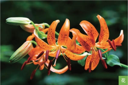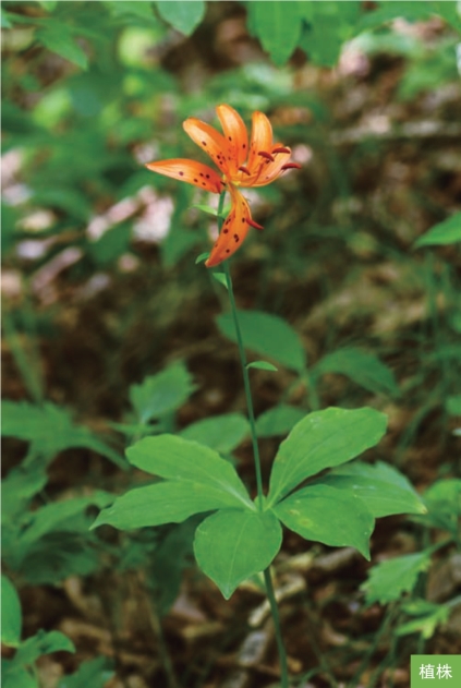 形态特征:多年生草本,高50~120厘米。鳞茎卵圆形,鳞片白色,有节。茎直立,有小乳头状突起。叶1轮,共6~15枚生于茎中部,上部还有少数散生叶;叶片倒卵状披针形至长圆状披针形,长6~15厘米,宽1~4厘米。花2~12朵排成总状花序;苞片叶状;花冠橙红色,具紫红色斑点,下垂;花被片6枚,稍反卷。蒴果倒卵形,长约2厘米,宽1.5~2厘米,具6条纵狭翅。花期7—8月,果期9—10月。