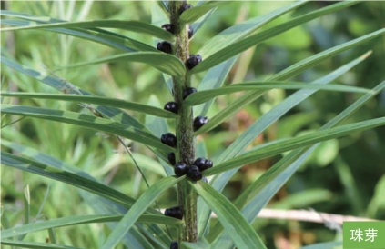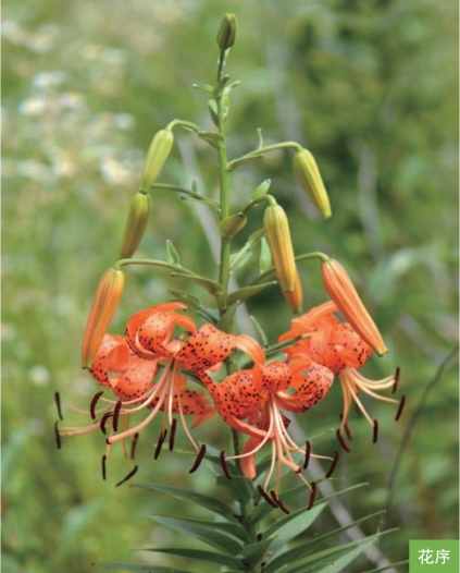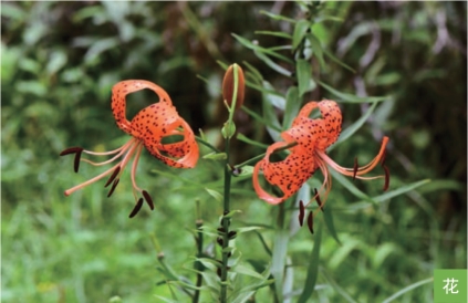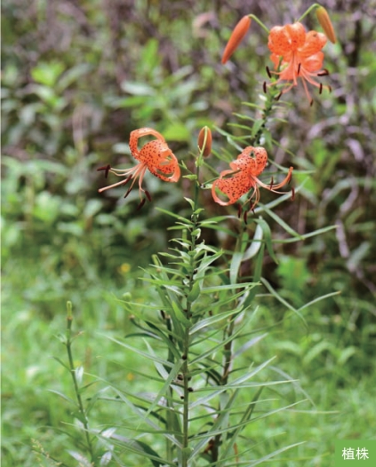 形态特征:多年生草本,高达1.5米。鳞茎宽球形,直径5~8厘米。茎直立,带紫色条纹,上部被白色绵毛。叶互生;叶片披针形或线状披针形,长3~15厘米,宽5~15毫米,顶端有白毛,边缘具乳头状突起,中上部叶腋有珠芽。花3~6朵或更多排列成总状花序;花冠橙红色,具黑紫色斑点,花下垂;花被片6枚,反卷。蒴果倒卵形,长3~4厘米。花期7—8月,果期9—10月。