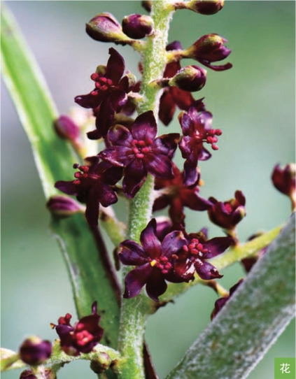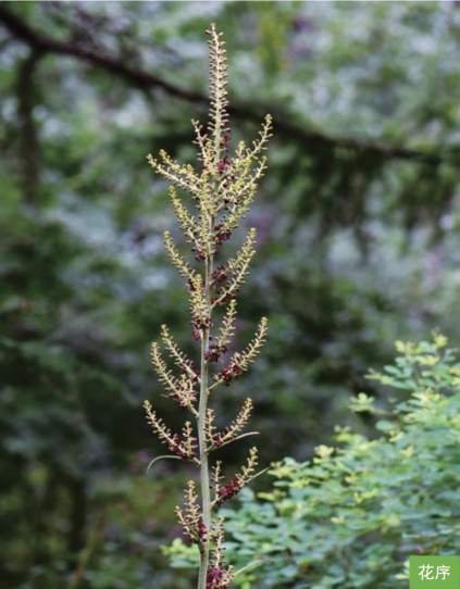 形态特征:多年生草本,高达2米。茎直立,粗壮,基部的叶鞘枯死后残留为有网眼的黑色纤维网。叶互生;下部叶椭圆形至长圆状披针形,长12~25厘米,宽8~18厘米,具封闭和抱茎的细长叶鞘;上部叶披针形,全缘或微波状。圆锥花序顶生,长30~50厘米;侧生总状花序通常具雄花,顶生总状花序多着生为两性花;总轴和枝轴密生白色绵毛;花被片6枚,黑紫色,开展或稍反折。蒴果卵形,有3棱,长1.5~2厘米,宽1~1.3厘米。种子具翅。花期7—8月,果期8—9月。