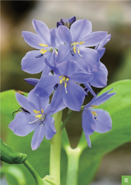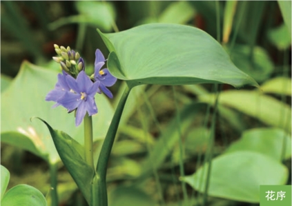 形态特征:一年生水生草本,高30~60厘米。茎直立,基部有时带紫红色。叶基生和茎生;叶片宽卵形或卵状心形,长5~12厘米,宽4~10厘米,顶端短尖,基部心形,全缘;叶柄基部增大成鞘,抱茎,有紫色斑。总状花序顶生;花10余朵,蓝紫色或蓝色;花被片6枚。蒴果长卵形,长8~10毫米。种子长圆形,长约1.5毫米,有纵棱。花果期7—10月。