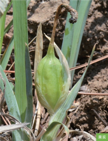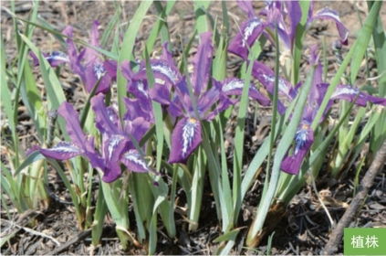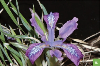 形态特征:多年生草本,高15~35厘米。根状茎短小,木质。叶基生;叶片线形,花期叶长5~13厘米,果期长达30厘米,宽约3毫米,基部鞘状,膜质。花茎长2~4厘米,不伸出或略伸出地面;苞片2枚,黄绿色,内含1朵花;花鲜紫色或蓝紫色;花被片6枚,2轮排列,外轮花被片有紫色及白色斑纹,中脉上有黄色须毛状附属物,内花被片顶端微凹。蒴果卵圆形或椭圆形,长3.5~4厘米,直径1.5~2厘米,果皮革质。种子红褐色,梨形。花期4—5月,果期6—8月。