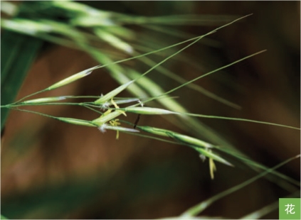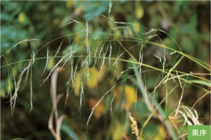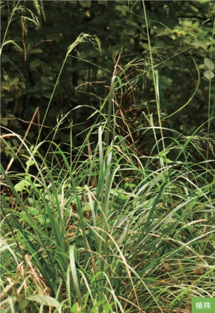 形态特征:多年生草本。秆直立,高达2米。叶互生;叶舌膜质,长约1毫米;叶片线形,长达50厘米,宽4~10毫米。圆锥花序开展,分枝2~6枚簇生,成熟后水平开展;小穗长6~10毫米,草绿色或紫色;颖膜质,近等长或第一颖稍短;外稃背部密被柔毛,芒长约2厘米,一回膝曲,芒柱扭转且具短微毛;内稃无脊,成熟时背部裸出。颖果纺锤形,长约4毫米。花果期7—9月。