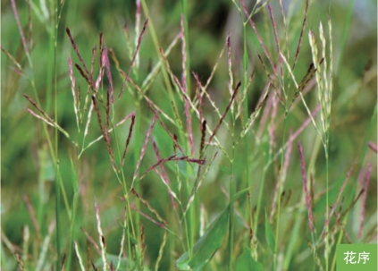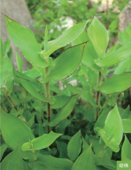 形态特征:一年生草本。秆细弱,高30~60厘米。叶互生;叶鞘具短硬疣毛;叶片卵状披针形,基部心形抱茎,长2~4厘米,宽8~15毫米。总状花序细弱,2~10枚呈指状排列或簇生于秆顶;有柄小穗退化仅剩长0.2~1毫米的短柄;无柄小穗灰绿色或带紫色,长3~4毫米;第一外稃透明膜质,第二外稃近基部伸出一膝曲的芒,芒长6~9毫米。颖果长圆形,与稃体近等长。花果期8—10月。