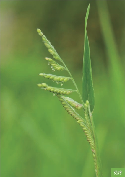 形态特征:一年生草本。秆直立,基部分枝,高30~100厘米。叶鞘松弛抱茎;叶片线形,长5~25厘米,宽5~15毫米。圆锥花序狭长,由4~8枚总状花序组成;总状花序长1.5~4厘米,密生柔毛,常排列于主轴之一侧;小穗长4.5~5毫米;第一颖微小;第二颖与第一外稃皆为膜质,与小穗等长,均被细毛;第二外稃革质,稍短于小穗。颖果卵圆形,长约3毫米。花果期7—10月。