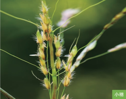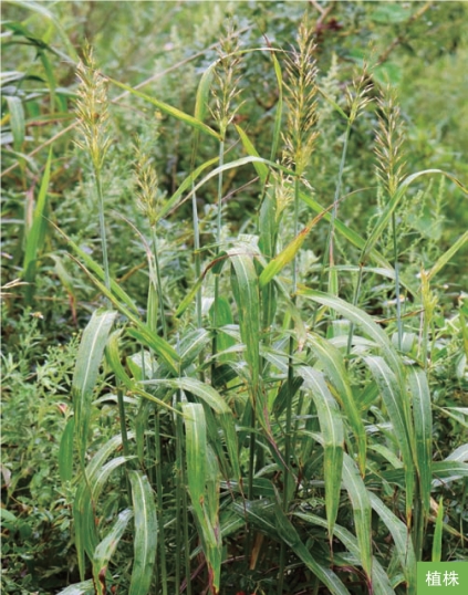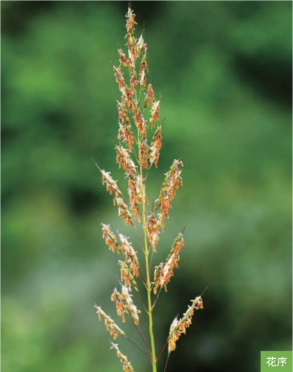形态特征:多年生草本。根状茎粗壮,被鳞片。秆直立,高70~150厘米。叶互生;叶片线状披针形,长15~28厘米。圆锥花序长圆形;小穗成对生于小枝各节,一有柄,一无柄;颖近等长;第一小花雄性;第二小花两性,外稃稍短于小穗,顶端深裂,裂齿间伸出长8~15毫米的芒,芒中部膝曲,芒柱扭转;内稃短于外稃。颖果棕栗色,长圆状披针形,长约2毫米。花果期7—10月。