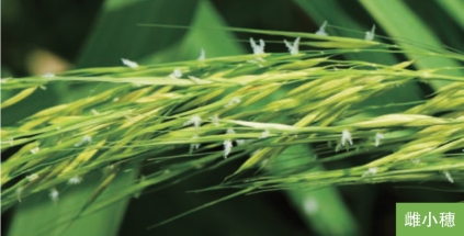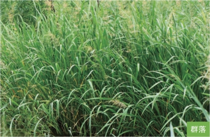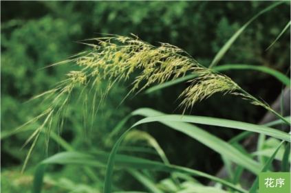 形态特征:多年生草本。具根状茎。秆直立,基部节上生不定根。叶互生;叶鞘长于节间,具小横脉;叶舌膜质,顶端尖;叶线形,长50~90厘米,宽1.5~3厘米。圆锥花序,分枝多数;雄小穗通常着生于花序下部,带紫色,外稃顶端渐尖或具短芒;雌小穗圆筒状,多位于花序上部和分枝下方与主轴贴生处,外稃具芒,芒长20~30毫米。颖果圆柱形,长约12毫米。花果期7—9月。