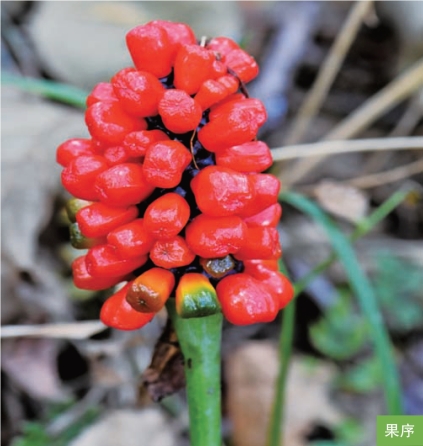 形态特征:多年生草本,高20~70厘米。块茎扁球形,顶部生根。基生鳞叶2枚,鞘状,黄棕色,有的带紫色斑纹。基生叶2枚,包裹花序柄,形成假茎,表面具浅绿色、淡紫色或暗褐色的蛇皮状斑纹;叶片鸟足状分裂,裂片5~17枚,中裂片具长1~4厘米的柄,侧裂片具短柄,向外渐无柄。肉穗花序单性;佛焰苞绿色,具白条纹。浆果成熟时红色或橘红色,卵球形。花果期5—9月。