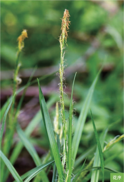 形态特征:多年生草本。秆丛生,高20~50厘米。叶片线形,质软。叶状苞片具长鞘。总状花序;小穗5~8个,顶生小穗为雄性,侧生小穗为雌性;雄花鳞片长5~5.5毫米,淡黄色;雌花鳞片长4.5~5毫米,淡褐黄色;果囊近于直立,长约7毫米,上部渐狭成长喙;柱头3个,较果囊长得多。小坚果紧包于果囊内,狭长圆形,三棱形,长约3.5毫米,黄褐色。花果期5—7月。
