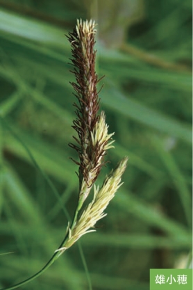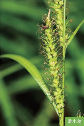 形态特征:多年生草本。秆高30~70厘米,粗壮。叶片线形,短于秆或与秆近等长,宽3~5毫米。雌小穗的苞片叶状,雄小穗的苞片呈刚毛状。小穗5~6个,上部2~3个为雄小穗,其余者为雌小穗;雌花鳞片狭披针形,长约5毫米,两侧红褐色,中间绿色;果囊长于鳞片,狭卵形,麦秆黄色,被疏毛,顶端渐狭为喙,喙口2齿裂;柱头3个。小坚果疏松地包于果囊内,椭圆形,三棱形,长约2.5毫米。花果期4—6月。