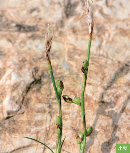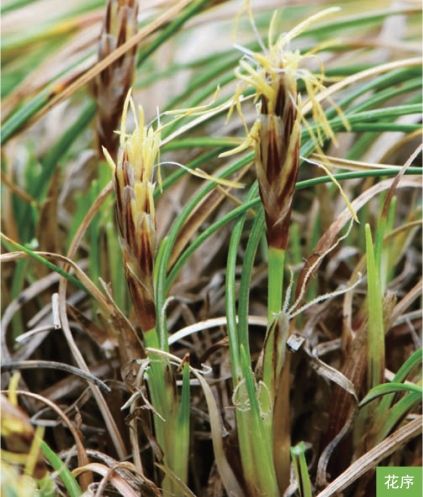 形态特征:多年生草本。秆紧密丛生,高2~5厘米。叶片线形,长于秆很多倍,宽1~1.5毫米。苞片鞘状,边缘为宽的白色膜质,中部褐锈色。小穗2~4个,远离生,顶生的1个雄性,具3~4朵花;侧生的为雌小穗,具1~2朵花;雄花鳞片披针形,红褐色,边缘白色宽膜质;雌花鳞片卵形,长约4毫米,锈褐色,中间具禾黄色的中肋,两侧边缘白色膜质;果囊倒卵形,三棱形,密被短柔毛,顶端骤缩成短喙,喙部紫红色,喙口全缘;柱头3个。小坚果成熟时暗褐色,倒卵形,三棱形,长2.5~3毫米。花果期4—5月。
