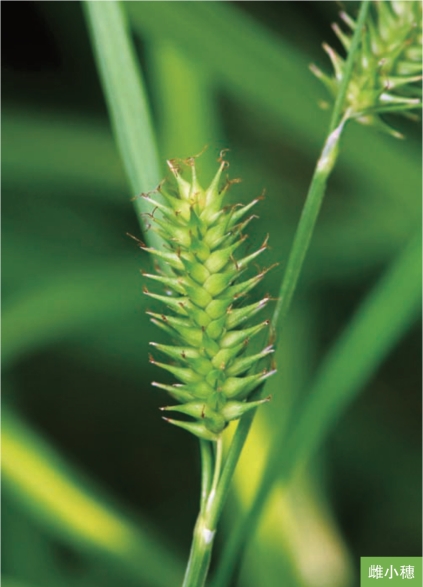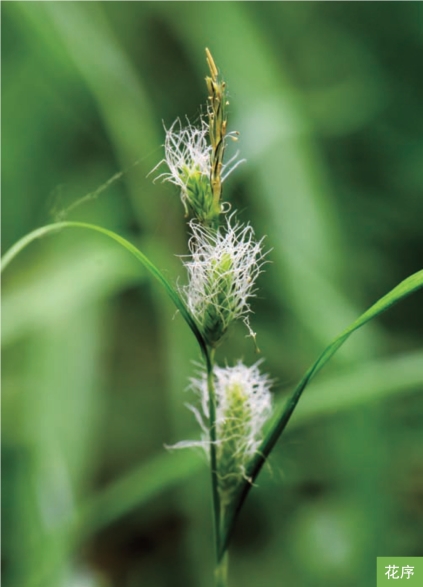 形态特征:多年生草本。秆疏丛生,高20~40厘米。叶片线形,与秆近等长,宽3~4毫米。苞片叶状。小穗3~4个,远离生,有时上部稍密集,顶生者为雄小穗,侧生者为雌小穗,短圆柱形或长圆形,长1~2厘米,花密生;雌花鳞片狭卵形,苍白色,长2~2.5毫米;果囊斜展,狭卵形或卵状披针形,长3~4毫米,顶端渐狭成长的喙,喙口微缺,白色膜质;柱头3个。小坚果淡棕色,稍疏松地包于果囊中,椭圆形或倒卵状椭圆形,三棱形,长约2毫米。花果期5—7月。