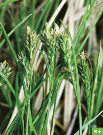 形态特征:多年生草本。秆丛生,高8~40厘米。叶片线形,短于秆,长6~35厘米,宽2~3毫米。苞片最下部的叶状,其余的刚毛状。总状花序;小穗2~4个,上部的接近生,顶生小穗雄性,侧生小穗雌性;雄花鳞片黄白色,顶端具短尖,背面中间绿色;雌花鳞片卵形、倒卵形,长2~2.5毫米,淡绿色或淡黄色,背面中间绿色,顶端具芒,芒长1~3毫米;果囊近等长于鳞片,倒卵形,钝三棱形,淡绿色,上部密被短柔毛,顶端具短喙,喙口微凹;柱头3个。小坚果栗色,卵形,长约1.8毫米。花果期5—7月。