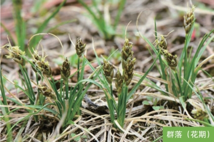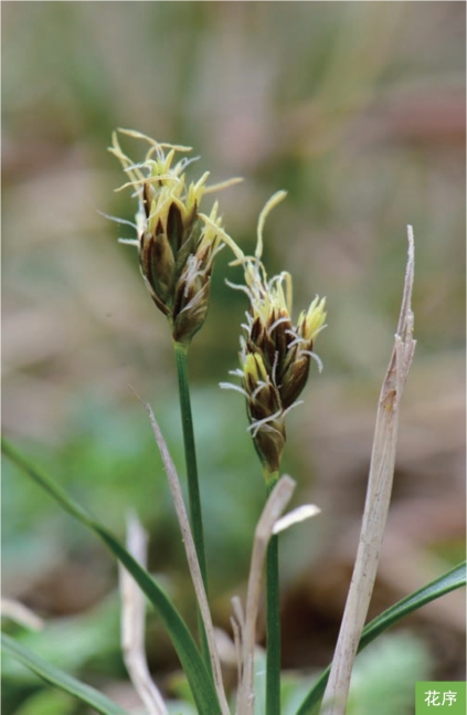 形态特征:多年生草本。植株呈束状,疏丛生,秆高10~20厘米。叶片线形,短于秆,宽1.5~2毫米,边缘稍内卷。穗状花序,小穗4~8个,尖塔状卵形,雄雌顺序;雌花鳞片宽卵形或椭圆形,长3~4毫米,锈褐色,边缘及顶端具极宽的白色膜质;果囊稍长于鳞片,锈褐色,椭圆形或卵形,长3~4毫米,革质,顶端急缩成短喙,喙口白色膜质,斜截形;柱头2个。小坚果卵形或椭圆形,双凸状,锈褐色,长约2毫米。花果期4—6月。