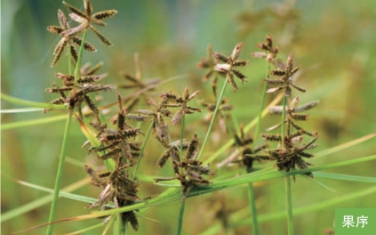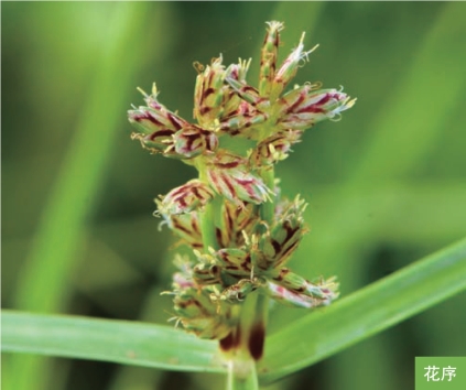 形态特征:一年生草本。秆丛生,直立,高5~50厘米。叶片线形,常短于秆,宽2~3毫米,上部边缘具白色透明的细刺。叶状苞片2~3枚,长于花序。长侧枝聚伞花序缩成头状或具1~5个不等长的辐射枝;小穗长圆形或长卵形,长5~10毫米,宽约3毫米;鳞片覆瓦状排列,膜质,卵形,长约2.5毫米,背脊绿色,两侧具宽槽,边缘暗血红色或暗褐红色;柱头2个。小坚果成熟时灰褐色,倒卵形,双凸状,长约1.2毫米。花果期6—10月。