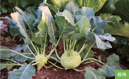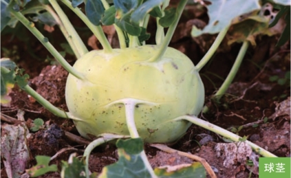 形态特征:二年生草本,高30~60厘米,全株无毛,有白粉。茎短,在离地面2~4厘米处膨大成一个实心长圆球体或扁球体。球茎上叶片宽卵形至长圆形,长10~20厘米,基部常有1~2枚裂片,边缘有不规则锯齿;茎生叶椭圆形至长圆形,边缘具浅波状齿。总状花序顶生及腋生;花淡黄色,直径2~2.5厘米。长角果圆柱形,两侧压扁,喙长约1厘米。种子直径1~2毫米,有棱角。花期5—6月,果期7—8月。