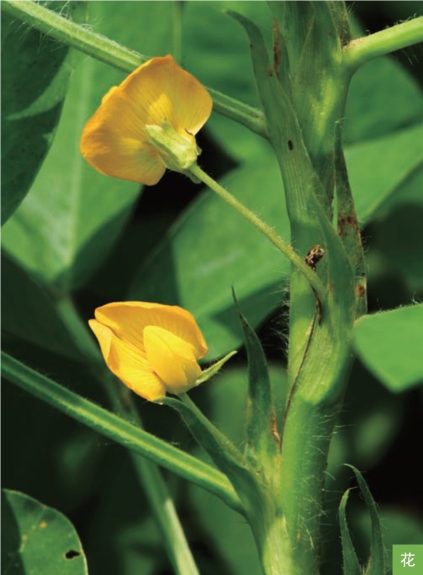 形态特征:一年生草本,高30~50厘米。根部有丰富的根瘤。茎直立或匍匐。叶互生;偶数羽状复叶具2对小叶;托叶长2~4厘米;小叶卵状长圆形至倒卵形,长2~4厘米,宽0.5~2厘米,全缘。花单生于叶腋或少数簇生;花黄色或金黄色;花后因子房柄延长而伸入地下结实。荚果长圆形,膨胀,长2~5厘米,宽1~1.5厘米,果皮厚,具明显网纹。花果期7—10月。