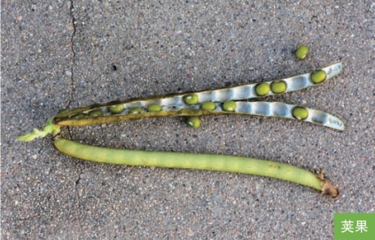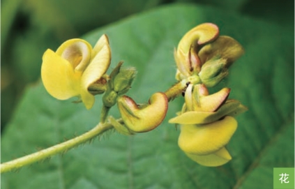 形态特征:一年生草本,高30~60厘米,全株被长硬毛。茎直立,上部稍蔓生。叶互生;羽状复叶具3小叶;小叶卵形、宽卵形或菱状卵形,长5~8厘米,宽4~7厘米,全缘。总状花序腋生,有花4朵至数朵;萼钟状,萼齿5枚;花冠淡绿色、黄色或淡黄色。荚果成熟时近黑绿色,线状圆柱形,长4~9厘米,宽5~6毫米。种子淡绿色或黄褐色,短圆柱形,长2.5~4毫米,宽2.5~3毫米。花果期7—9月。