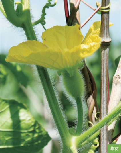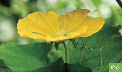 形态特征:一年生草本。茎蔓生,粗壮,密被棕黄色硬毛。卷须2~3歧,被粗硬毛。单叶互生;叶片宽卵形或肾状近圆形,宽15~30厘米,5~7浅裂或中裂,基部深心形,弯缺深,边缘有小齿,两面均被硬毛。花单性,雌、雄同株,单生于叶腋;花萼筒宽钟形,密生刚毛状长柔毛;花冠黄色,辐状,直径6~10厘米。瓠果大型,果实长圆柱状或近球状,有硬毛和白霜,长25~60厘米,直径20~40厘米。种子白色或淡黄色,卵形,扁,长10~11毫米。花期6—8月,果期9—10月。