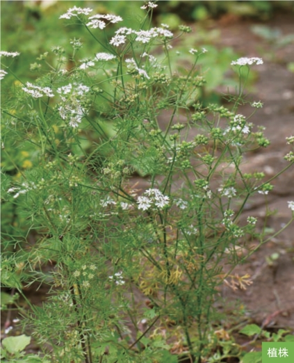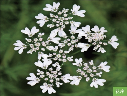 形态特征:一年或二年生草本,高20~100厘米,全株无毛,有香气。茎圆柱形,直立,多分枝。基生叶及茎下部叶有柄,基部鞘状;叶片一至二回羽状全裂,羽片宽卵形或扇形半裂,长1~2厘米,宽1~1.5厘米,边缘有钝锯齿、缺刻或深裂;茎上部叶二至三回羽状分裂,终裂片狭线形。复伞形花序顶生或腋生;小伞形花序有孕花3~9朵;花白色或粉红色,边花外侧1枚花瓣特大,2深裂。双悬果球形,直径约3毫米,光滑。花果期7—9月。