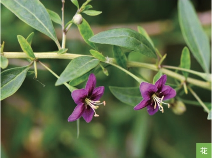 形态特征:落叶灌木,高0.8~2米。小枝细密,略斜升或弓曲,有不生叶的短棘刺和生叶、花的长棘刺。叶互生或簇生;叶片披针形或长椭圆状披针形,长2~3厘米,宽4~7毫米,栽培时长达12厘米,宽1.5~2厘米。花在长枝上1~2朵生于叶腋,在短枝上2~6朵同叶簇生;花萼钟状,通常2中裂;花冠漏斗状,紫堇色。浆果红色或红橙色,宽椭圆形、长圆形或近球状,长8~20毫米,直径5~10毫米。种子棕黄色,略呈肾形,扁压,长约2毫米。花期6—9月,果熟期7—10月。