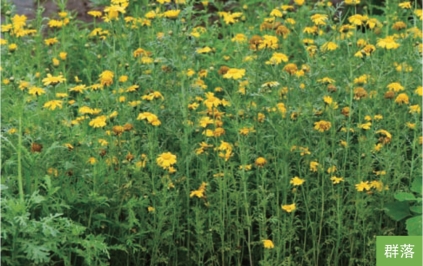 形态特征:一年生草本,高30~90厘米。全株光滑无毛,带香味。茎直立,自上部分枝。叶互生;茎下部叶花期枯萎;茎中部叶无柄,半抱茎,长8~10厘米,一至二回羽状深裂。头状花序单生于枝端,数个排成伞房花序;总苞片4层;边花舌状,雌性,黄色;中央花管状,两性,黄色。舌状花瘦果三棱形,具3条宽翅肋;管状花瘦果两侧压扁,有明显的肋。花期6—7月,果期7—8月。