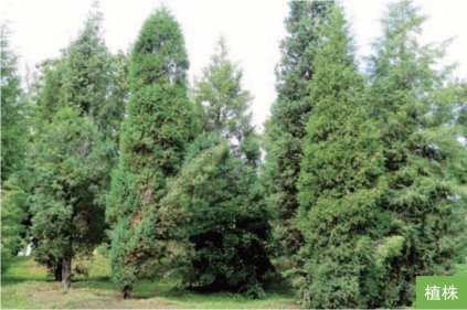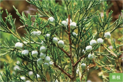 形态特征:常绿乔木,高达20米。树皮暗灰褐色,老时纵裂,成狭片状剥离。一年生枝绿色,2~3年生枝渐变为红褐色至紫褐色。叶二型,即刺叶及鳞叶;刺叶生于幼树之上,老龄树则几乎全为鳞叶;刺叶3叶交互轮生,鳞叶交互对生或3叶轮生。雌、雄异株,稀同株;雄球花黄色,椭圆形;雌球花圆形,紫绿色。球果浆果状,近圆球形,直径6~8毫米,两年成熟,熟时暗褐色,被白粉或白粉脱落。花期4—5月,果熟期9—10月。