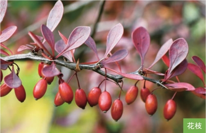 形态特征:落叶灌木,高达2米。枝条开展,具细条棱,幼枝紫红色,老枝灰棕色或暗紫褐色,具棱;茎刺单一,偶3分叉。叶于短枝端丛生;叶片倒卵形、匙形或菱状卵形,长1~3厘米,宽6~10毫米,常为紫红色。花2~5朵组成伞形花序或近簇生;萼片6枚,内轮萼片稍大;花瓣6枚,黄色。浆果红色,椭圆形,长约1厘米。种子棕褐色。花期4—5月,果期9—11月。