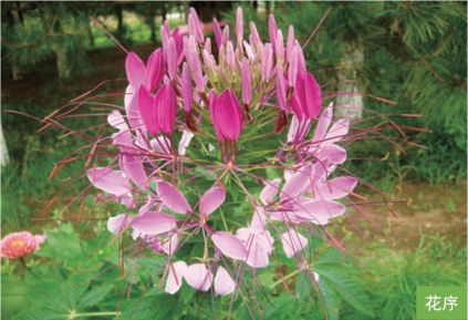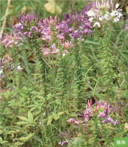 形态特征:一年生草本,高达1.5米,全株被黏质腺毛,有特殊臭味。叶互生;叶片为掌状复叶,具5~7小叶,小叶片椭圆状披针形或倒披针形,中央小叶最大,最外侧的最小。总状花序长达40厘米;苞片叶状,卵状长圆形;萼片4枚;花瓣粉红色,少见白色。蒴果圆柱形,长5.5~6.5厘米。种子肾形,直径约2毫米。花期7—8月,果期8—10月。