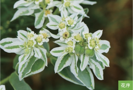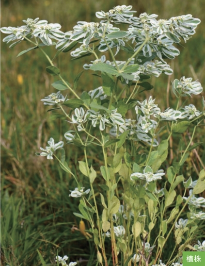 形态特征:一年生草本,高达1.2米。茎直立,中部以上叉状分枝,被白色柔毛。茎下部叶互生,绿色,茎上部叶轮生或对生,花期边缘变白色或全部变白色;叶片卵形或长圆形,长3~7厘米,宽2~3厘米。杯状聚伞花序腋生;总苞杯状,密被短柔毛,檐部4~5裂,绿白色;腺体4枚,半圆形,边缘具白色附属物;雄花多数,伸出总苞外;雌花1枚。蒴果三棱状扁球形,直径5~7毫米,被柔毛。种子淡黄色,圆柱状,长3.5~4毫米,表面具瘤状突起。花果期7—