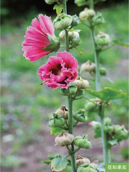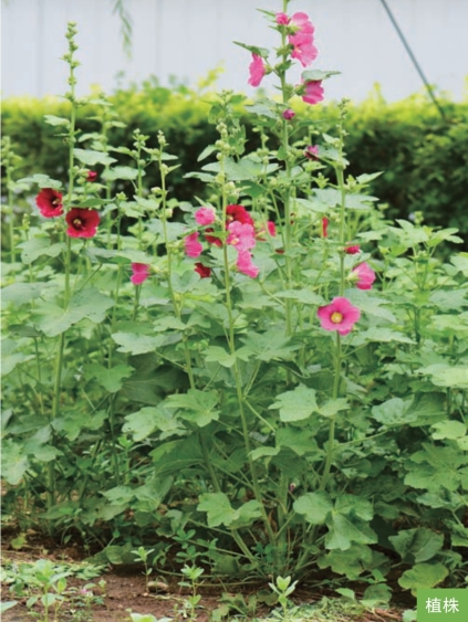 形态特征:一年生草本,高达2米。茎直立,粗壮,被星状簇毛。叶互生;叶片圆形至卵圆形,长5~10厘米,宽4~10厘米,通常3~7浅裂,边缘具不整齐圆齿,两面疏被星状柔毛。花腋生,单生或近簇生,排列成总状花序式;小苞片杯状,常6~7裂;萼杯状,5齿裂,密被星状粗硬毛;花大,直径6~10厘米,有红、紫、白、粉红、黄和黑紫等色,单瓣或重瓣。果实扁球形,直径约2厘米,被短柔毛,分果20~30个,近圆形,具纵槽。花期6—8月,果期7—9月。
