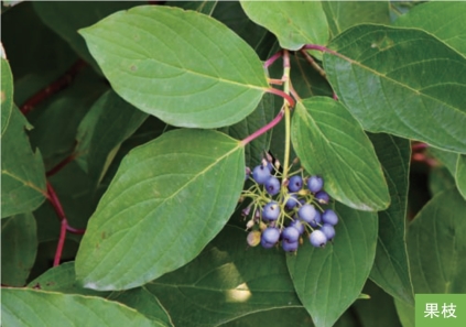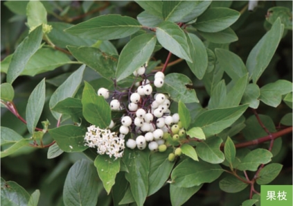 形态特征:落叶灌木,高达3米。树皮暗红色。枝血红色。叶对生;叶片椭圆形,稀卵圆形,长4~10厘米,宽2~5厘米,边缘全缘或波状反卷,表面绿色,背面灰白色。伞房状聚伞花序顶生,较密;花小,白色或淡黄白色;花萼裂片4枚;花瓣4枚。核果成熟时乳白色或蓝白色,长圆形,微扁,长约8毫米,直径5.5~6毫米;核棱形,侧扁,两端尖,长约5毫米。