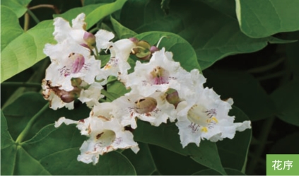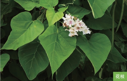 形态特征:落叶乔木,高6~10米。树冠卵圆形。叶对生;叶片卵心形至卵状长圆形,长15~30厘米,宽10~20厘米,顶端长渐尖,基部截形至浅心形,全缘或有时1~2齿裂,背面密被黄褐色短柔毛,侧脉腋间具黑褐色腺斑。圆锥花序顶生,长约15厘米;花萼2裂,舟状。花冠二唇形,白色,下唇筒部有2条黄色条纹及紫色细斑点。蒴果圆柱形,长20~50厘米,直径1~1.5厘米,2瓣开裂。种子长圆形,两端有极细的白色丝状毛,连毛长约6厘米。花期5—6月,果期9—10月。