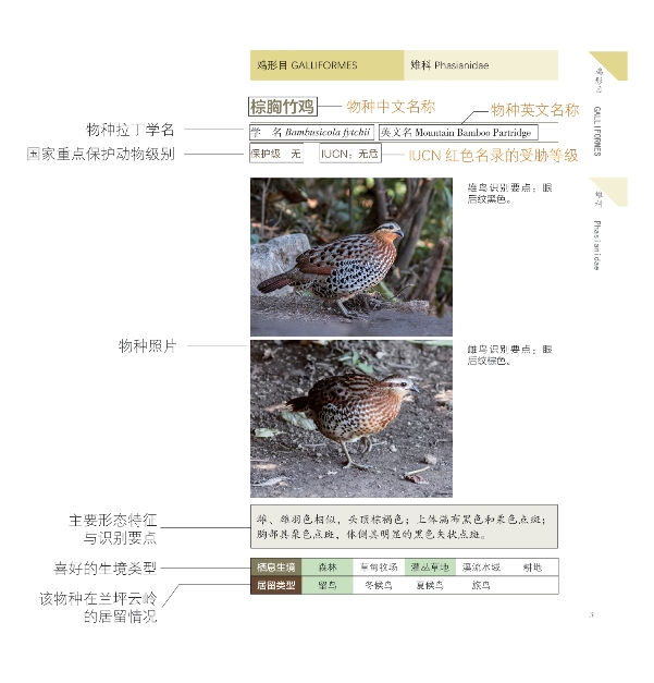 本书中鸟类的中文、英文名称、拉丁学名以及分类学排列顺序依据《中国鸟类分类与分布名录》第三版(郑光美,2017)。本书共收录17目58科260种鸟类,有国家重点保护野生鸟类47种,其中一级重点保护鸟类有4种,二级重点保护鸟类有43种。使用说明以3页“棕胸竹鸡”为例: