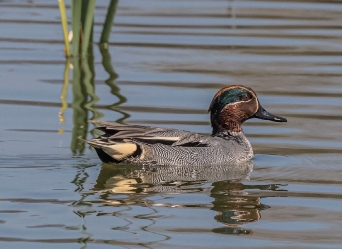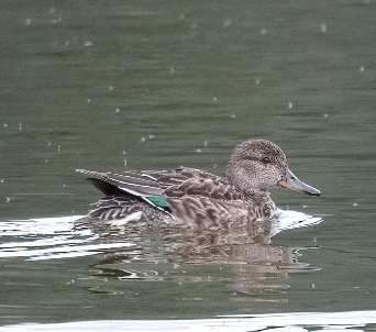 雌鸟:翅具有翠绿色的翼镜,背部羽毛黑褐色,羽缘淡棕白色。