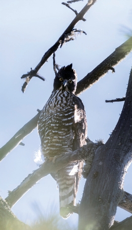 具长羽冠,上胸具纵纹,下胸及以下具有横纹,翼下和尾下具有多条黑白相间的横纹。