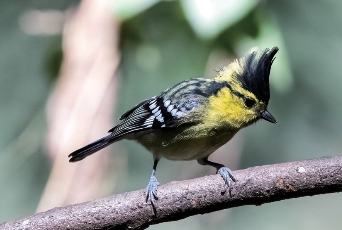 羽冠的前半部分为黑色,颊和枕部鲜黄色,眼后方有黑色眼线。雄鸟自喉至腹部有大块黑斑,整体鲜亮,雌鸟整体对比不似雄鸟强烈而偏黄绿色。
