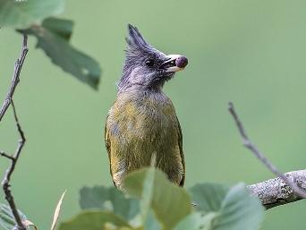 头灰色,羽冠明显,喙象牙白色;下体黄绿色。