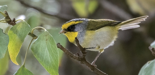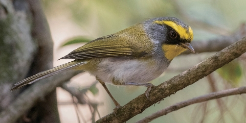 眼罩黑色,粗著的眉纹和喉部鲜黄色,颊及颈侧灰色;上体橄榄绿色,下体近白色。