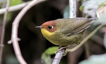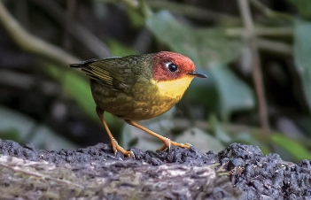 前额、头顶栗红色,喉亮黄色;身体余部橄榄绿色。