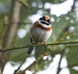 头顶橙棕色,眼罩黑色,喉中央具黑色斑块;胸具有栗红色横条带,翅和尾黑褐色。