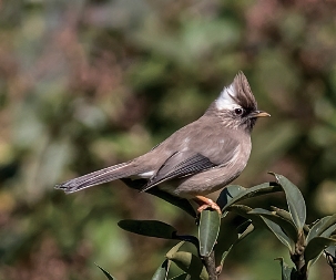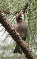 整体褐色,羽冠明显,头顶黑褐色,额及颏近黑,眼后至枕部白色。