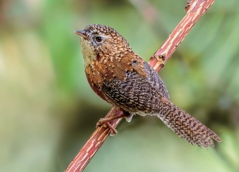 喉白色;头、胸和上背黄褐色,满布白色点斑;翅和尾黑褐色,满布白色和黑色相间的横斑。