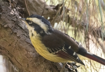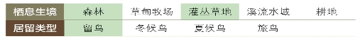 头黑色,具有宽阔的白色眉纹。雄鸟飞羽和尾羽外缘红色;雌鸟飞羽和尾羽外缘为浅黄色,下体浅黄色。