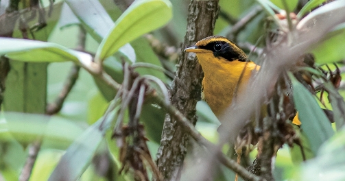 雄鸟体羽以亮黄色为主,具黄色细眉纹,过眼纹和颊黑色。雌鸟颜色不似雄鸟鲜艳,缺少黑色眼罩。
