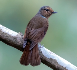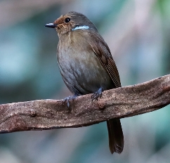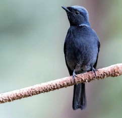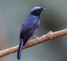 雄鸟通体蓝黑色,眼周和颊黑色,头顶、颈侧具有亮蓝色斑。雌鸟体羽褐色,前额基部和眼先沾锈黄色,颈侧同样具有亮蓝色斑。